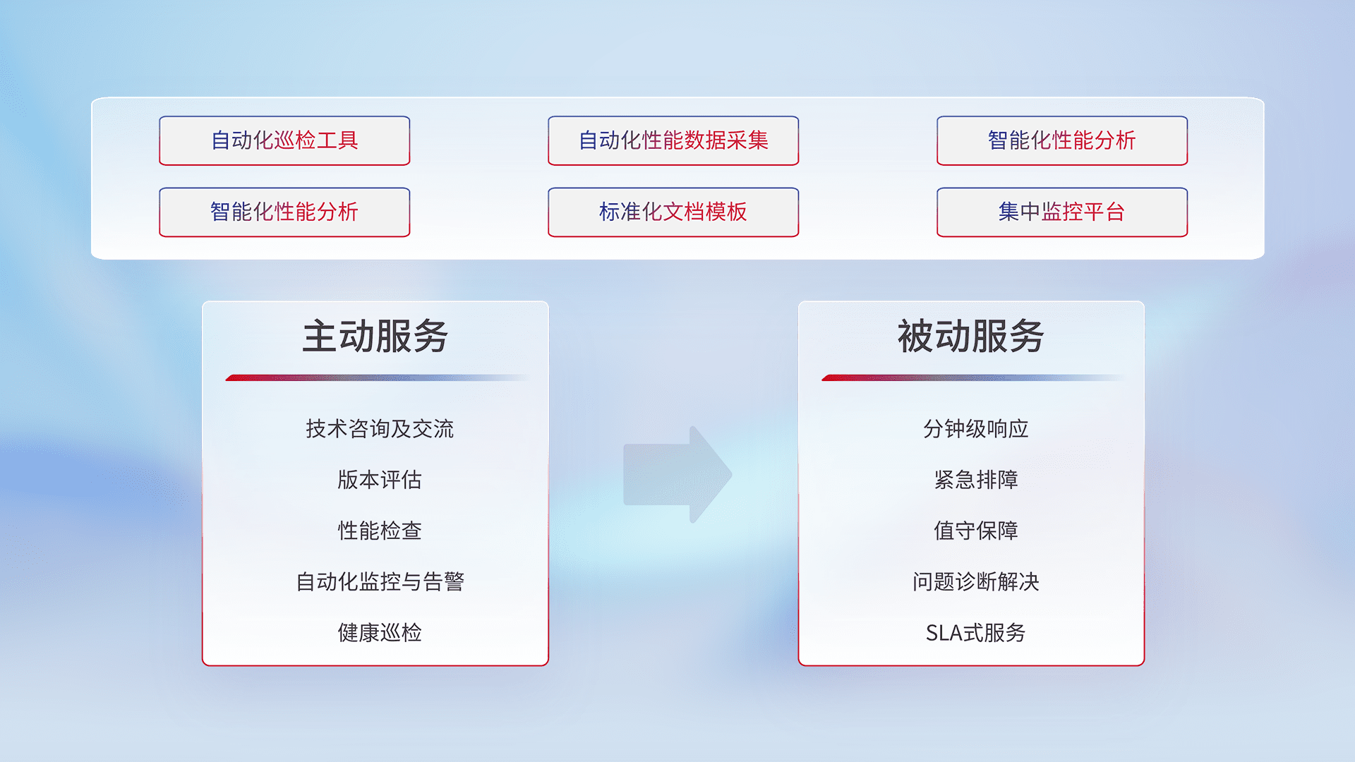 智能化工具和标准化文档,,保障服务质量,,提供主动服务(包含技术咨询、、、版本评估、、性能检查、、、自动化监控与告警、、健康巡检)和被动服务包含(分钟级响应、、、、紧急排障、、值守保障、、问题诊断解决、、、SLA服务)。。。。